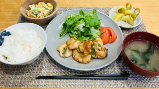 今日の晩ごはん 今日の晩ごはんは鶏胸肉を使って節約レシピです。鶏胸肉は旦那が筋トレしているということもありよく使います。今回は揚げ焼きしているので少しカロリーは上がっているのですが、たまにはいいかなということで揚げ物にしました。 メニュ...